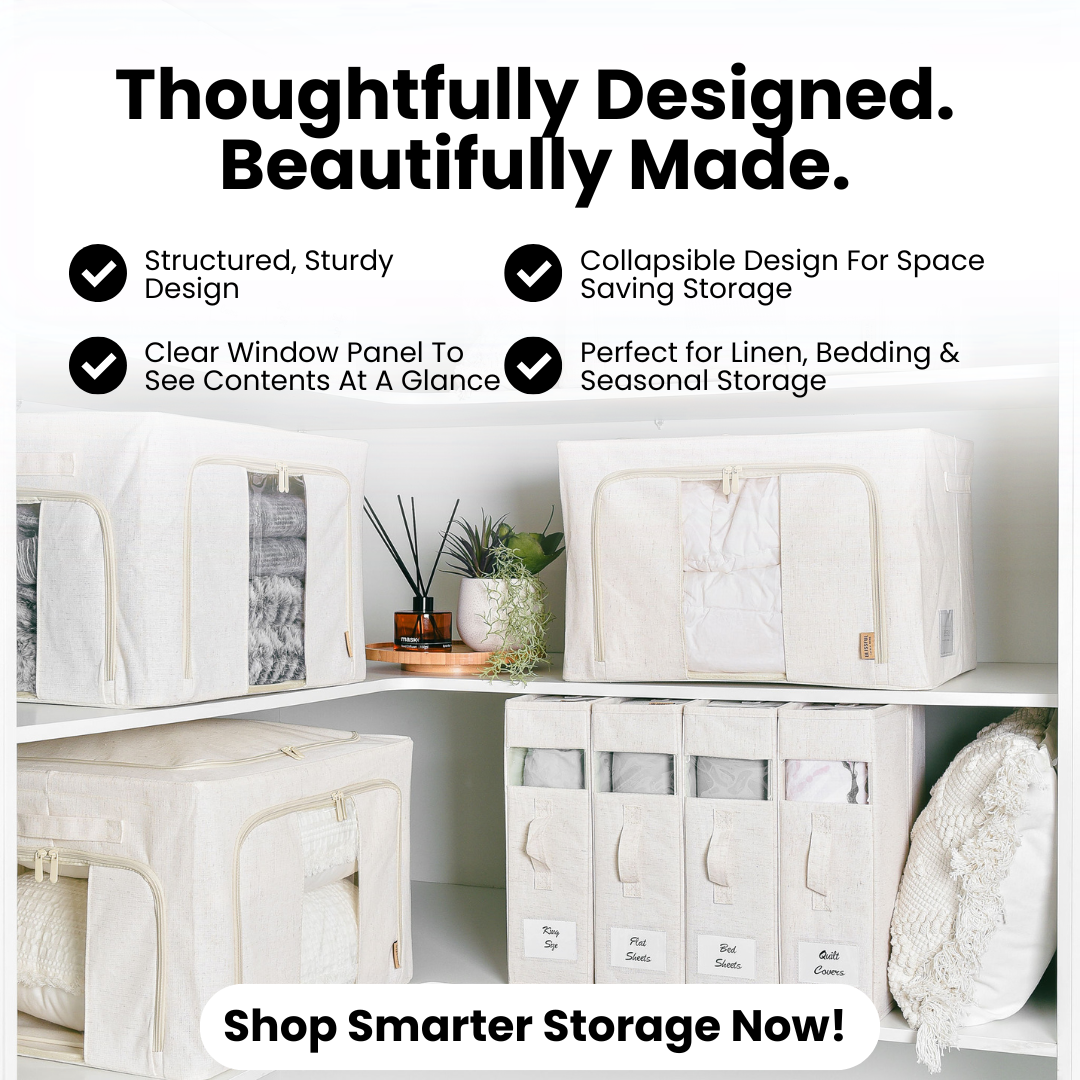 The SlimFold boxes are ideal for neatly storing sheets and pillowcases, with a clever two way design, sturdy frame, and collapsible structure for easy flat storage when not in use.