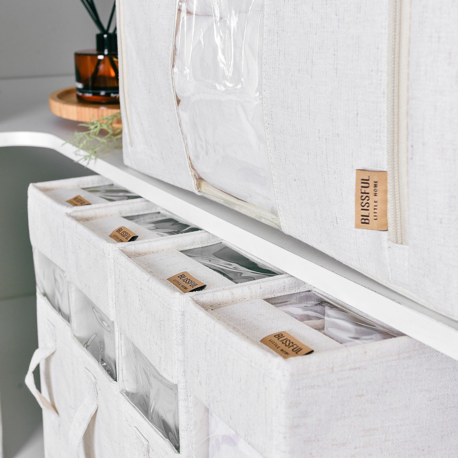 Finished in a Beige cotton/linen material, this coordinated set blends seamlessly into any home while keeping your storage beautifully organised.